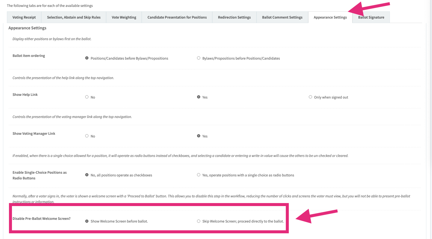 To bypass the above Welcome screen, simply goto Ballot > Settings, click the Appearance tab, and scroll down to the bottom of the settings list. Change the "Disable the Pre-Ballot Welcome Screen" setting to Skip Welcome... Then select the "Save Settings" button at the bottom of the screen. See screen capture below.