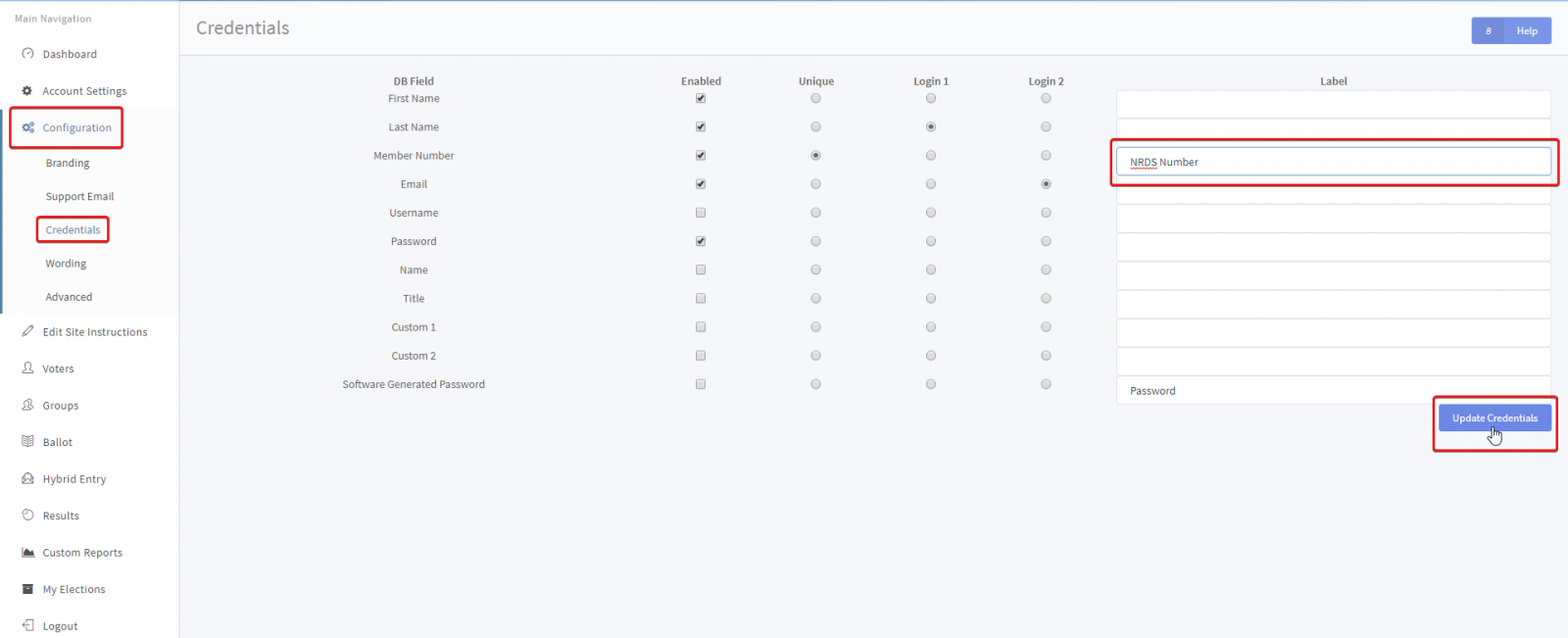 AssociationVoting uses 2 credential login to identify and authenticate the voter during login. Whatever is set as Login 1 and Login 2 will be the login fields for the voter. To the right is a label field. If you wish to rename a field, such as changing the wording of ‘Member Number’ to ‘NRDS Number’, type that into the ‘Label’ field.