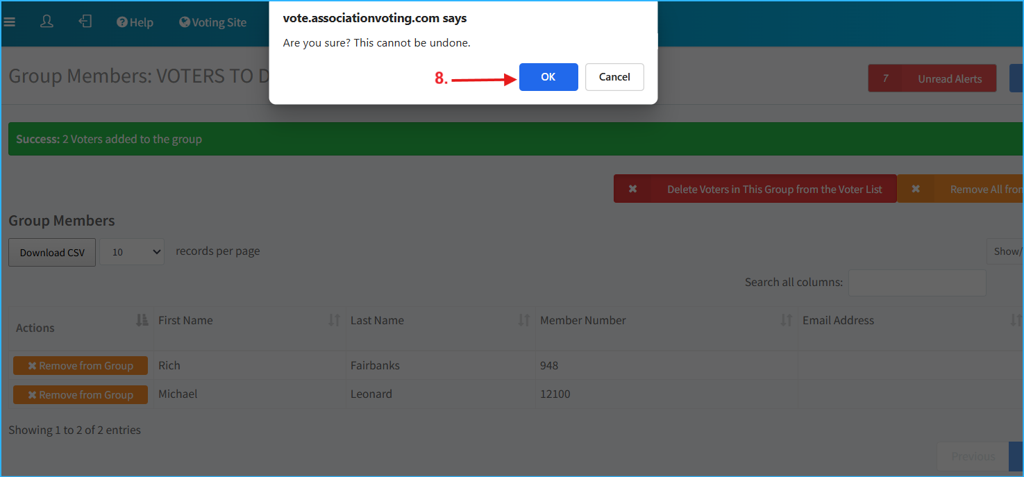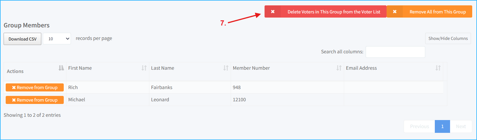- Click the red button in the upper right corner "Delete Voters in This group from the Voter List"