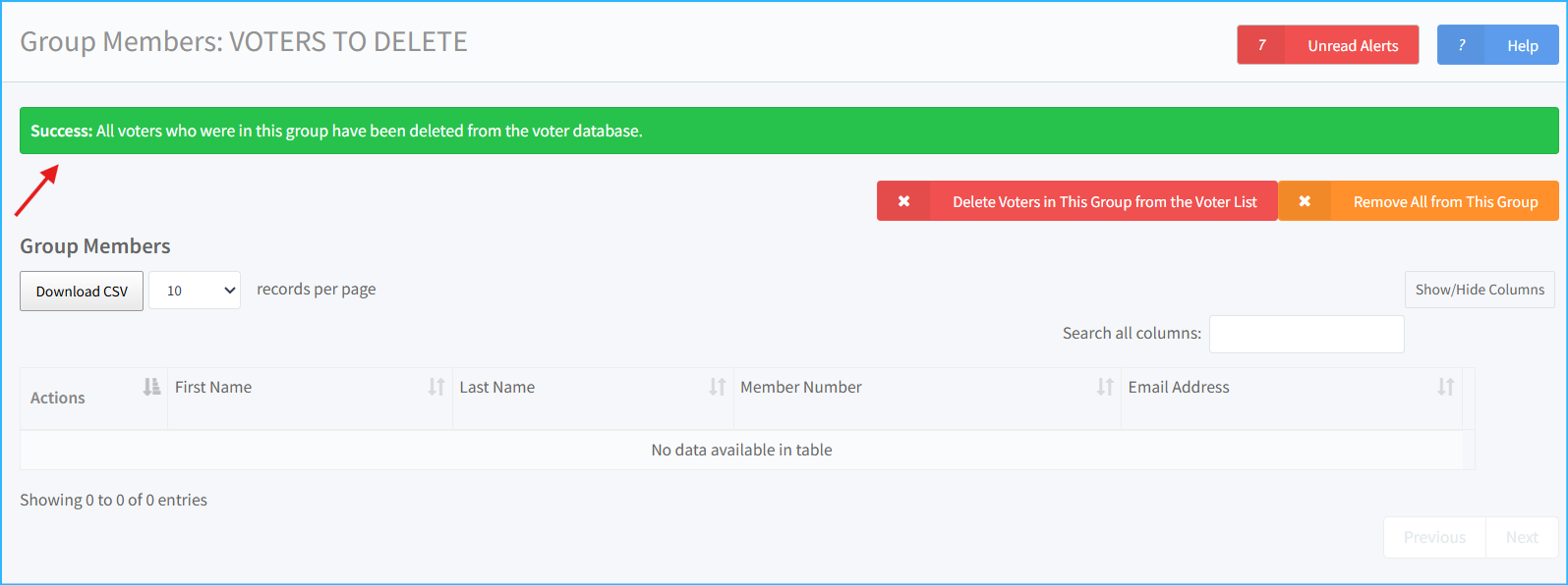 The next page will display a green bar at the top of the page to confirm that the voters have been deleted (see image below)