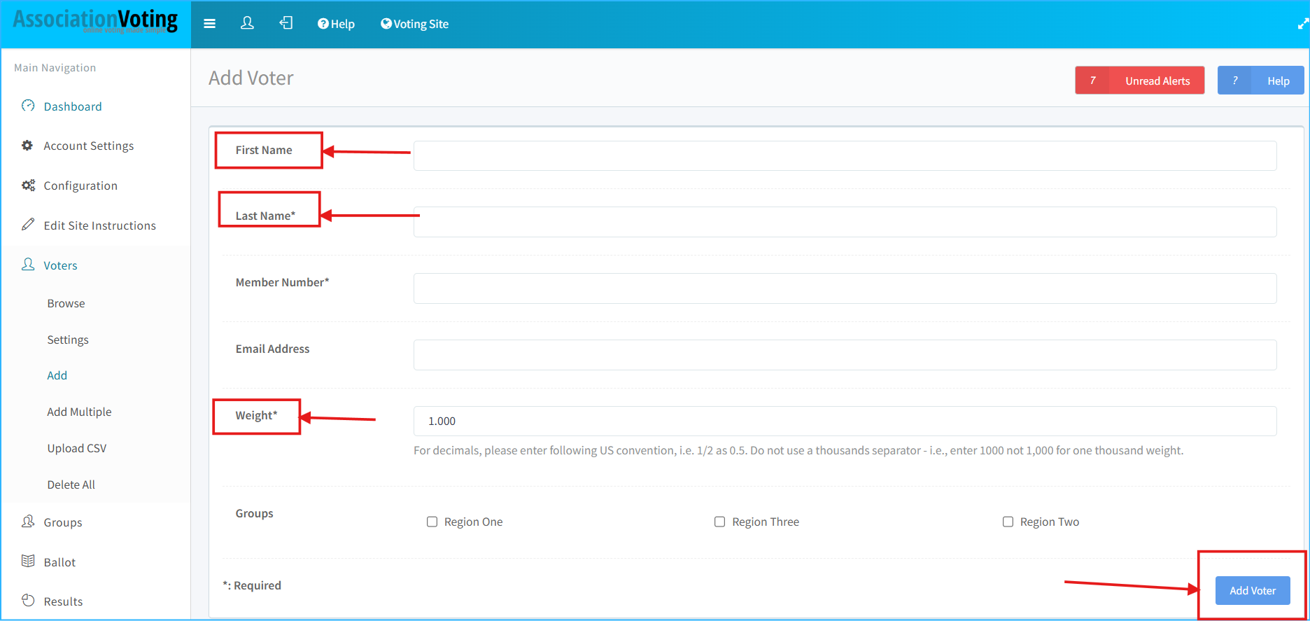 After clicking add you will be brought to the add voter page. Here you will see some of the credential information is started (*) this is must-have information before they can be added then if they belong to a specific group you can check off each one needed below the primary information. After you have finished simply press the Add voter button to save them.